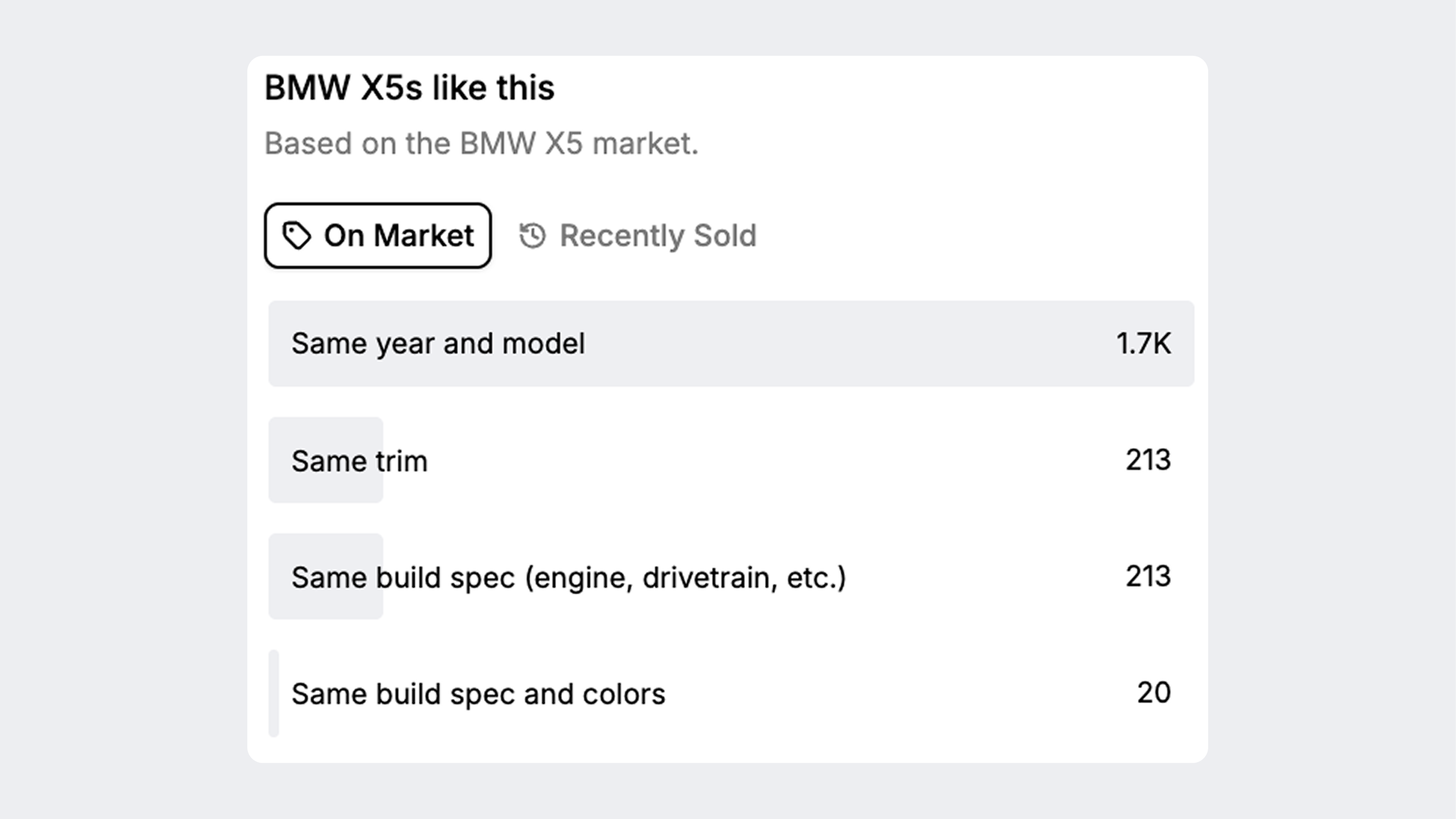 Value is one critical facet to evaluating an off-market listing, but so is rarity. Below the pricing section, you’ll see a new “Like This” section that gives you a sense of how rare this vehicle is in the current market, or even among listings that have recently sold.