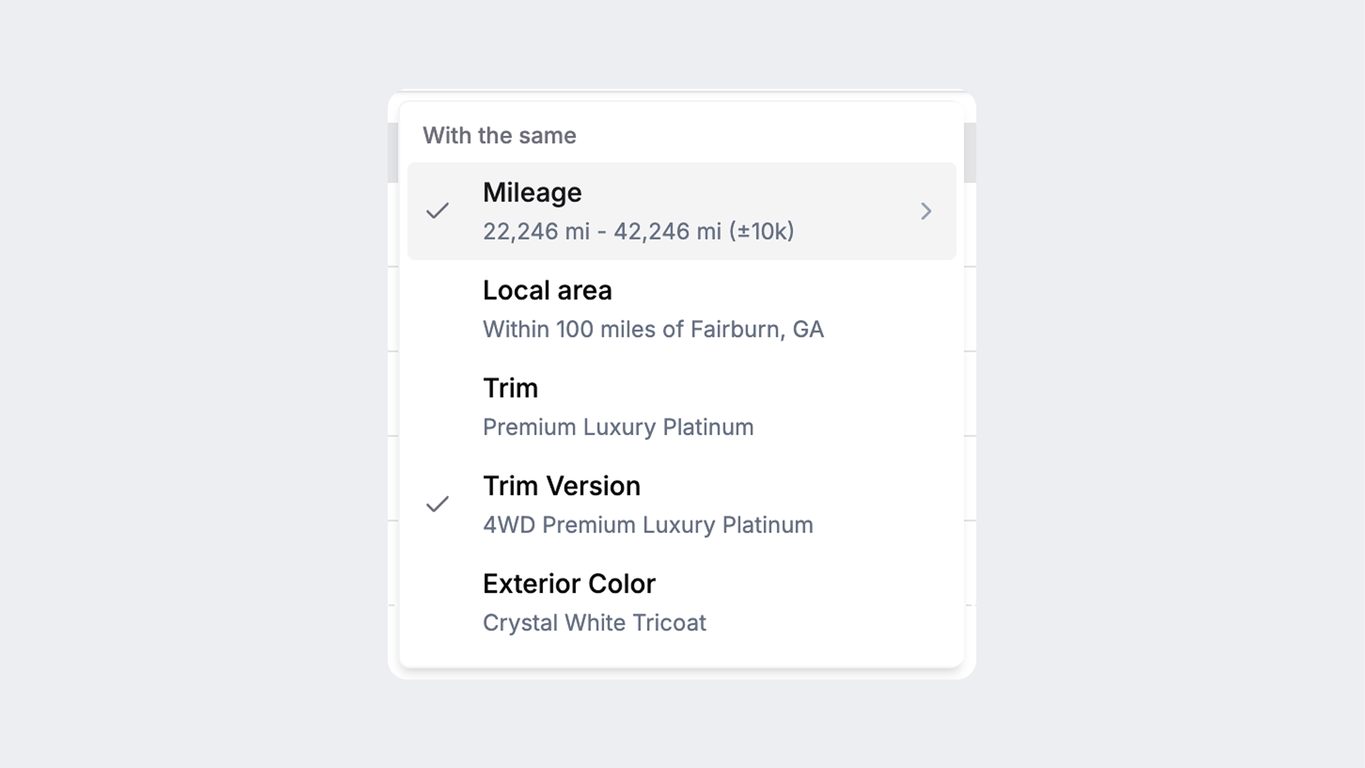 Before, there were set categories on which you could compare a listing to others: same build, same local area. Now, you have an incredible degree of control over how to compare. Want to compare against others with the same exterior color? Total MSRP? Even sold listings? You got it. We’ll add even more attributes to compare against in the near future, but we think this is a great new way to flip through comparable listings and judge just how good of a deal you’re getting.