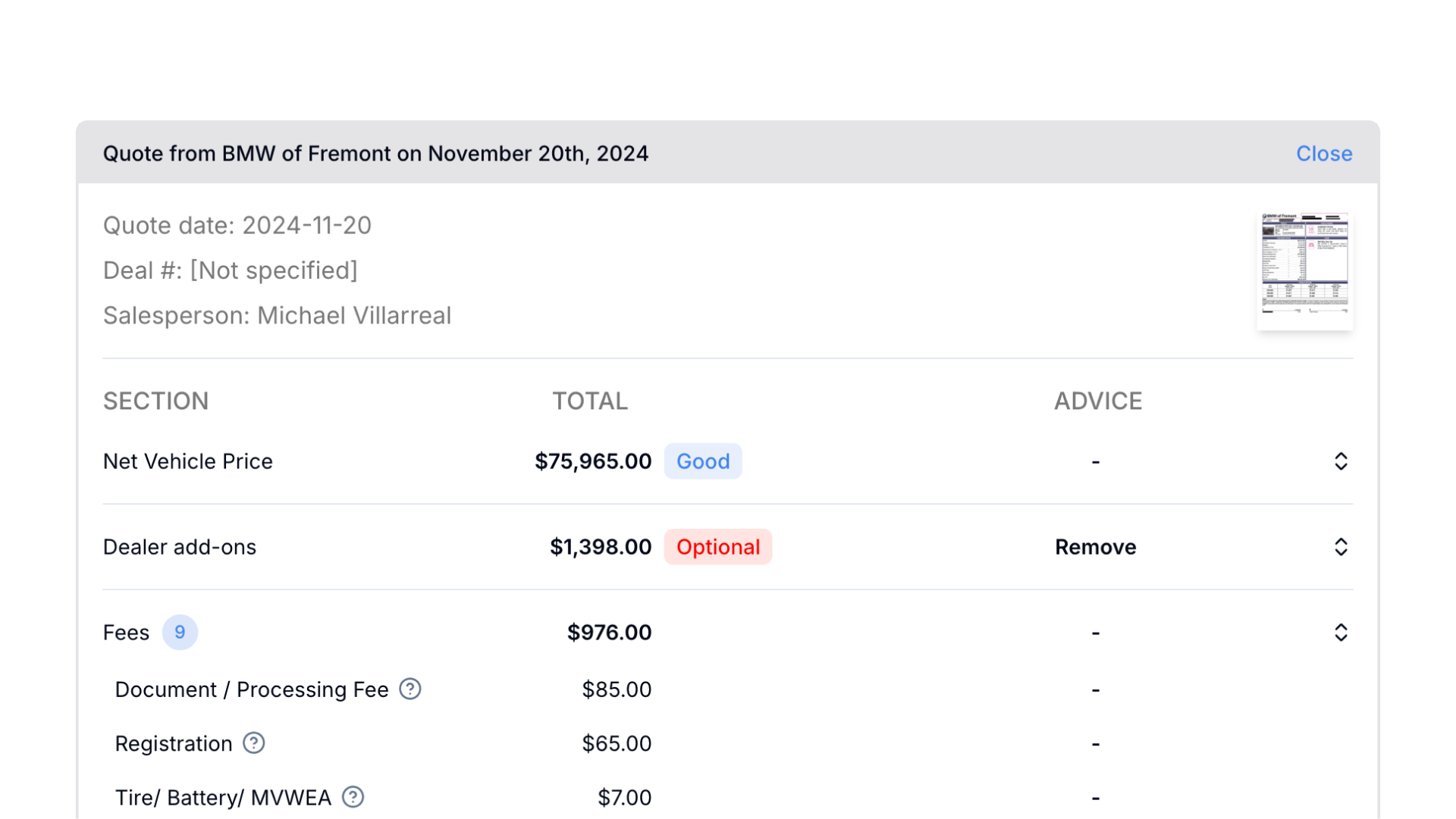 From your deal, so that you can see all the numbers in one consistent format. We’ll even give you advice on some of these numbers so that you can more easily negotiate with the dealer. Not sure what a certain fee or dealer add-on means (looking at you “CA TIF,” “CHP FEE,” or “RECOVR”)? Click the ? icon next to the name to see a common sense explanation.