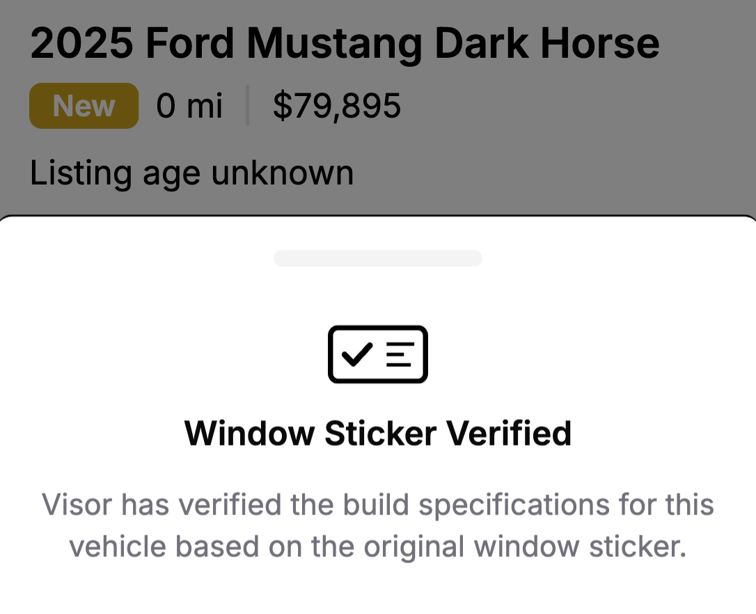 Starting this week, you may start seeing badges on listings indicating whether Visor has reviewed the window sticker to determine the exact build specification of the vehicle being sold.